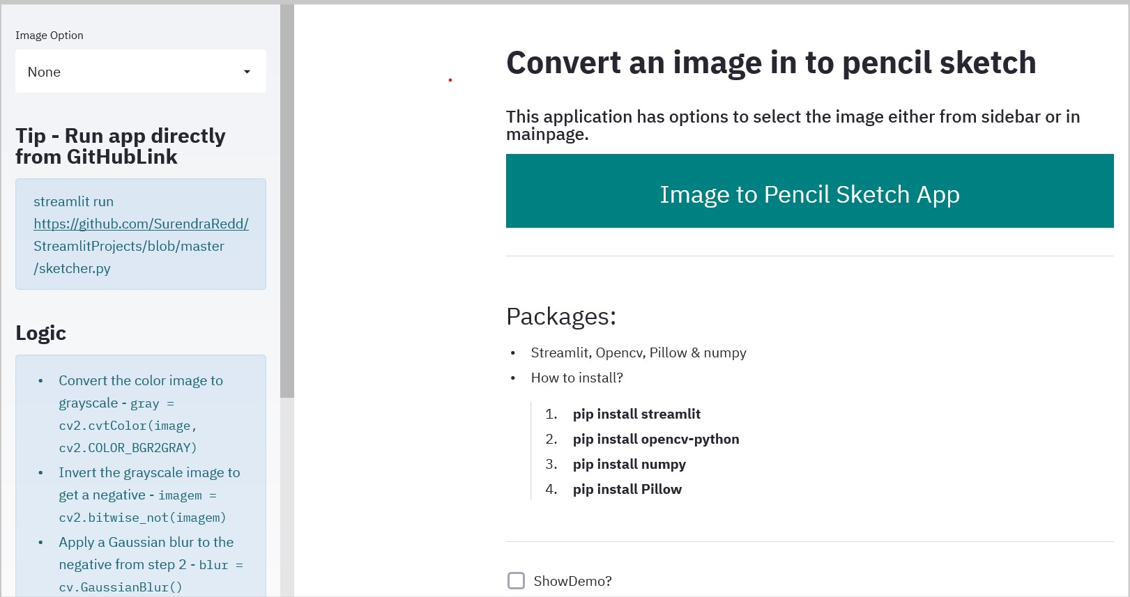 - Created a simple app using streamlit to convert image into pencil drawn sketch image.